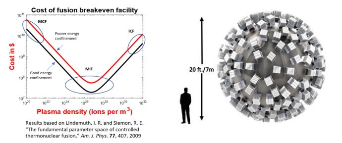 PJMIF是一种利用多(几百)束高速(~100km/s)喷射的高z等离子体压缩磁化等离子体靶,以大幅提高等离子体参数实现聚变的方法,目标等离子体密度将达到1026m-3,介于磁约束聚变和惯性约束聚变之间,是一种新型的实现聚变的中间路线,具有结构相对简单、成本相对低廉的优势,当然压缩过程中的不稳定性是需要解决的一个重要问题。