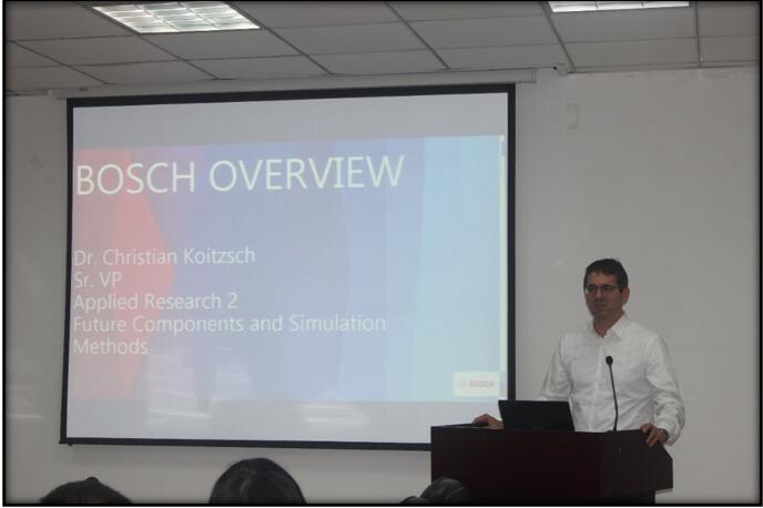博世中央研究院的Dr. Christian Koitzsch作了 “Introduction of Bosch CR and division of Future Components and Simulation Methods ”(博世CR的介绍及未来组件的划分和仿真方法)的报告,他简要介绍了博世中央研究院、未来元件与仿真方法部门,举例说明了Bosch的宗旨“Technology to enhance quality of life”(科技成就生活之美)以及校企合作项目的相关情况。