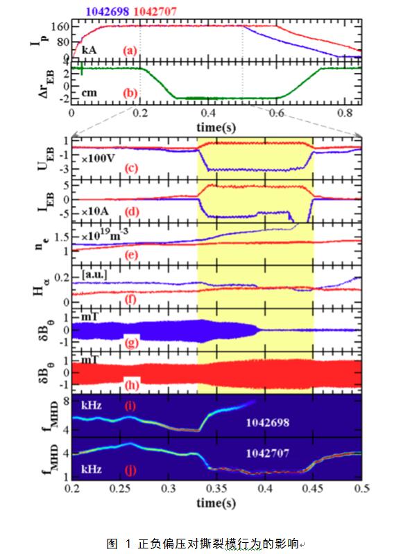 作者在文章中提出,撕裂模(TM)或新经典撕裂模(NTM)等宏观磁流体不稳定性会降低托卡马克等离子体的约束性能,甚至造成放电的终止。在实验中,通过将带偏压的石墨电极(偏压极性及大小相对于装置地而言)伸入到等离子体内部几厘米深的位置,发现负偏压对撕裂模存在置稳的作用,而正偏压对撕裂模存在解稳作用,如图1所示。通过偏压扫描实验发现,环向转动速度的变化量,2/1撕裂模的频率和磁扰动的幅度与偏压大小成线性关系。当偏压达到一定阈值时,可以完全抑制撕裂模(负偏压阈值)或发生锁模(正偏压阈值),并且偏压阈值与边界安全因子等因素有关,如图2所示。分析认为偏压电极会在电极所处位置和最外闭合磁面(限制器接地) 之间产生径向电流,从而产生环向和极向电磁力矩驱动等离子体旋转,影响撕裂模的频率和振幅。该实验研究为抑制撕裂模,缓解撕裂模锁模引起的等离子体破裂提供一种可能的途径。