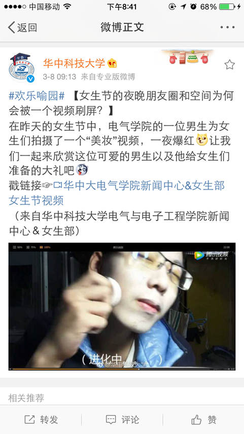 3月7日的晚上,由我院女生部和院新闻中心联合给众女神送上的化妆教程视频发布,并在院内外引起了巨大反响,播放量已经达到25万。华中科技大学官方微博也转载了视频,不仅让更多人认识了电气学院,也让更多人了解,认识到了一个不一样的华科。相信这样的女生节,会让女生们切实感到温暖,让“电气同心力”的精神发扬下去。同时也为华科增添了一分人文的精神与关怀。