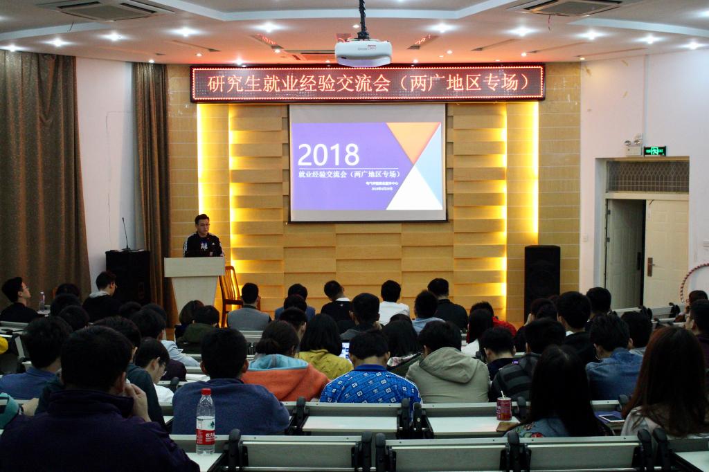 4月26日晚,电气学院就业服务中心在西九楼502报告厅举办了就业经验交流会(两广地区)。就业服务中心工作的志愿者的邹竟成、杨之翰分析了2018届毕业生在两广地区的就业情况,分别签约广东电网,南方电网、广州供电局、深圳供电局的郭乾、罗奕、黄晨辉、高德民分享了他们在就业方面的宝贵经验并答疑。研究生辅导员雷浩楠到会并作交流总结。