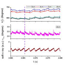 创新性地研究了扫描扰动场锁模阈值法、扰动场补偿法等多种误差场补偿方法,可为ITER误差场补偿提供参考。通过加入不同相位的扰动场,观测撕裂模不均匀转动的特征,可以确定误差场补偿的最优幅值和相位。成功利用转动扰动场实现了撕裂模的解锁,验证了ITER上利用扰动场进行锁模控制的可行性,在避免锁模破裂方面意义重大,相关成果发表在2016年PPCF上,并评为年度亮点文章。研究发现了扰动场穿透等离子体的阈值随密度变化先上升后下降的现象,并发现了等离子体转动对穿透阈值的贡献,更新了研究界原来“穿透阈值随密度限行变化”的观点。